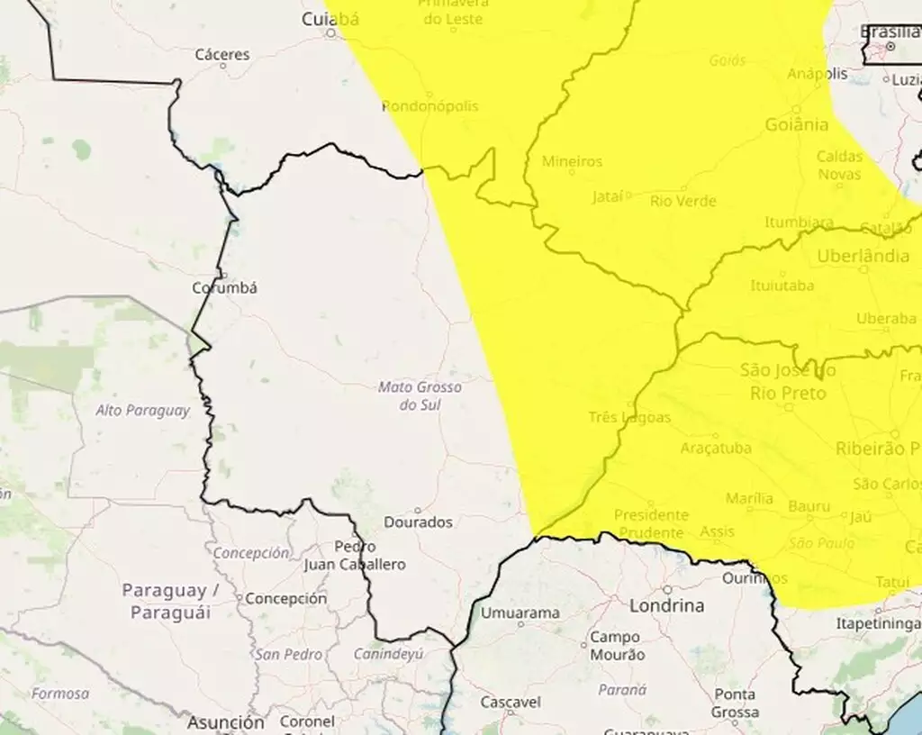 O Inmet (Instituto Nacional de Meteorologia) emitiu alerta para chuva intensa em 24 municípios de Mato Grosso do Sul. Há risco de volume de chuva de até 50 milímetros por dia e ventos de até 60 km por hora.