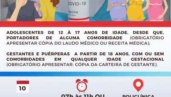 Com apenas 270 doses da vacina contra a Covid-19 será destina a primeira dose para adolescente de 12 à 17 anos de idade, desde que, portadores de alguma comorbidade, gestantes e puérperas a partir de 18 anos, com ou sem comorbidades em qualquer idade gestacional.