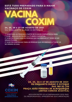 A vacinação começa hoje (24) e vai até sexta-feira (27), e acontecerá na praça João Ferreira de Albuquerque (antiga concha acústica) das 18h às 21h. Tem vacina para todos os públicos incluindo primeira e segunda dose.