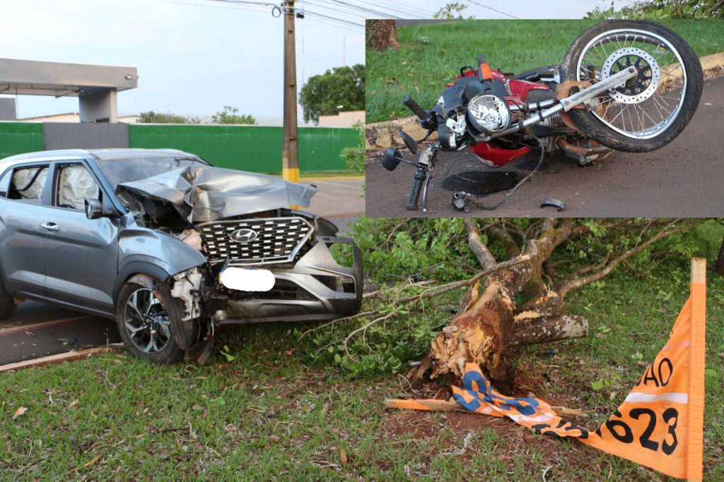 Após coldiir com a moto, o veiculo somente parou, com uma colisção que derrubou uma arvore.