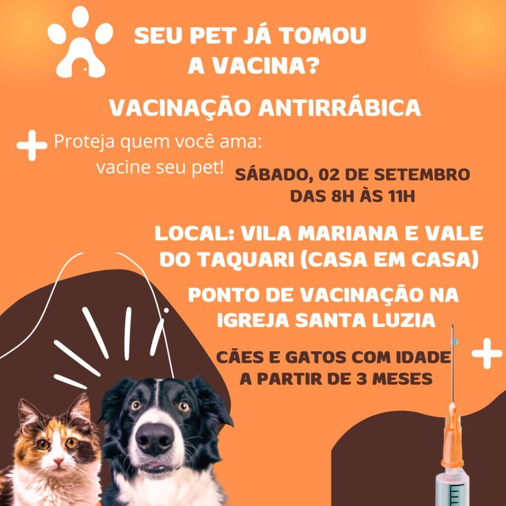 A equipe do controle de zoonoses estará passando de casa em casa nas regiões da Vila Mariana e do Vale do Taquari, das 8h às 11h. Os moradores dessas áreas devem manter seus animais presos e identificados para facilitar o trabalho dos vacinadores. Também haverá um ponto de vacinação na Igreja Santa Luzia.