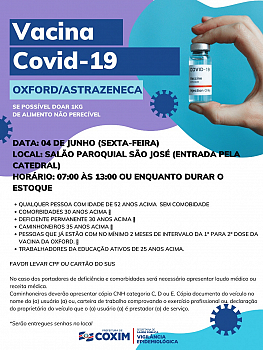 Pessoas com idade a partir de 52 anos sem nenhum tipo de comorbidade são os próximos a serem vacinados em Coxim, a vacinação será nesta sexta-feira (4) no Salão Paroquial São José das 7:00 às 13:00 horas. Serão entregues senhas para as pessoas que forem receber o imunizante da Oxford/AstraZeneca.