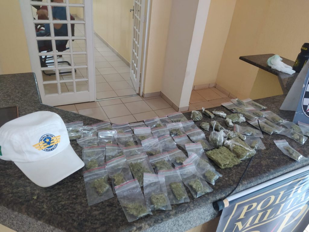 Após várias buscas nas imediações pelas equipes de serviço foi possível abordá-lo e encontrar várias porções de maconha jogada pelo caminho que passou com o intuito de enganar os PMs, porém acabou confessando ser dono da droga.