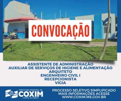 Conforme o Edital 001/2023, o Processo Seletivo Simplificado, visa a contratação temporária de profissionais para trabalharem na rede municipal da Prefeitura de Coxim. Os cargos são para Assistente de Administração, Auxiliar De Serviços de Higiene e Alimentação, Arquiteto, Engenheiro Civil I, Recepcionista e Vigia.