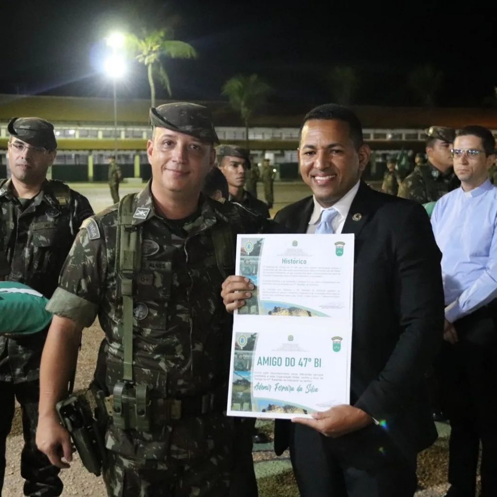 O Presidente da Câmara, Ademir Peteca, participou nesta quinta feira (29), da comemoração do Dia do Soldado, realizada no 47º Batalhão de Infantaria Guerreiro Pantaneiro – . Durante a noite de homenagens, honrarias e formatura, Peteca recebeu o título de Amigo do Batalhão, junto a outras personalidades locais. A celebração, marcada pela emocionante demonstração de patriotismo, teve ainda a presença de outros representantes do Governo Municipal, além de Corpo de Bombeiros, Polícia Militar, vereadores e sociedade civil.
